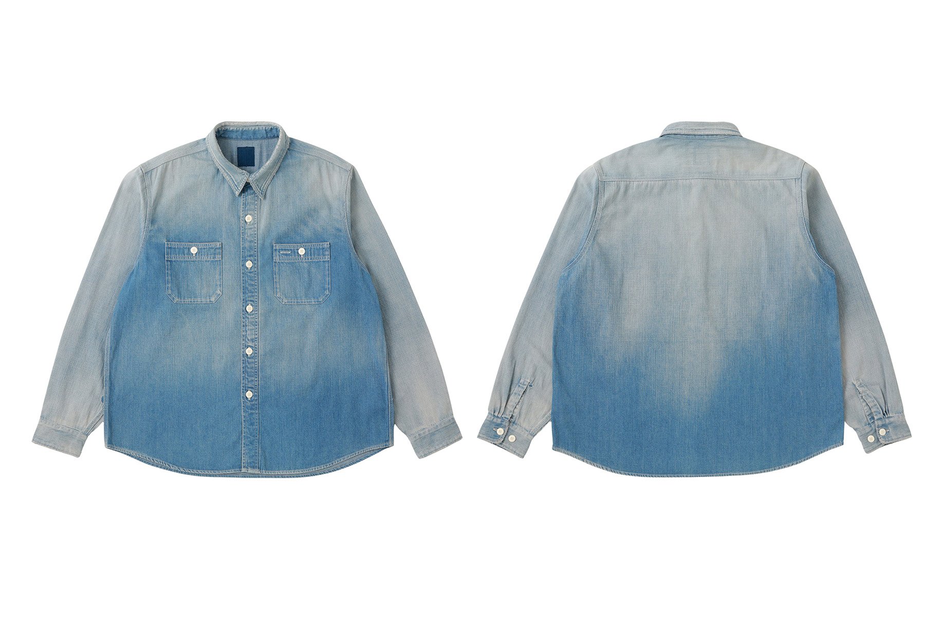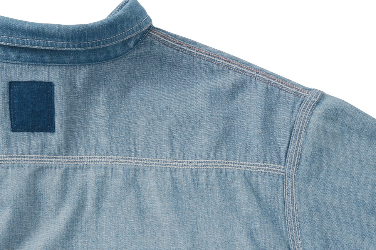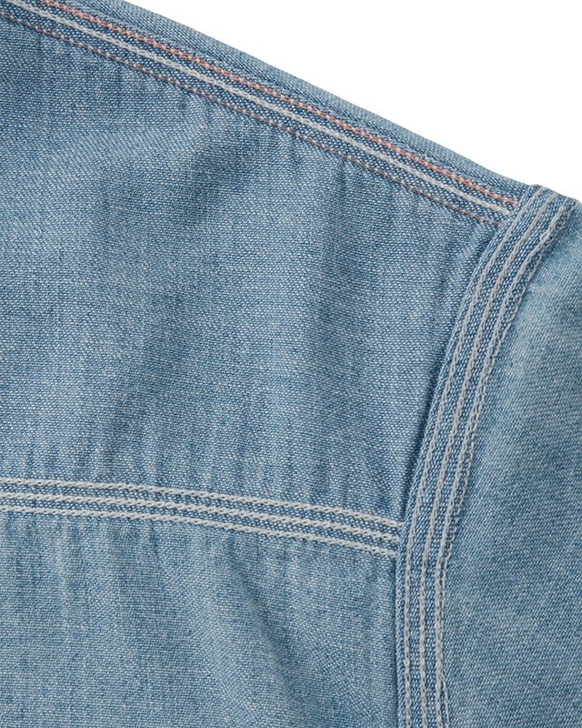 A work shirt made with a custom 8 oz. denim material that has orange selvedge details. Each individual shirt undergoes a damaged finish processing that is applied by hand to create a naturally worn in textural appearance and feel.
