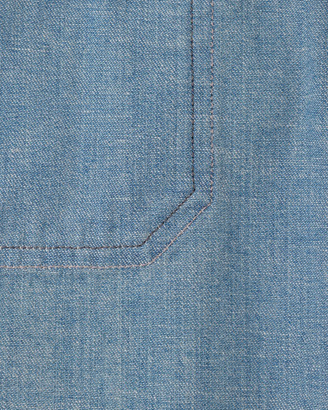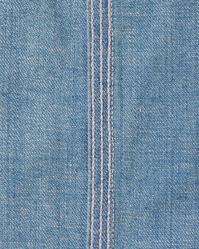 An archival denim shirt was the inspiration piece for the textural expression and faded appearance we attempted to apply to this fabric we developed. The shirt also had some very unique details that is not seen very often in other similar pieces. This shirt incorporated multiple-colored threads for the inner construction of the garment that cannot be seen when the shirt is worn. We assume this to be an accidental detail that was created when the hidden bobbin thread ran out and the sewer decided to utilize whatever extra thread they had on hand regardless of its color.