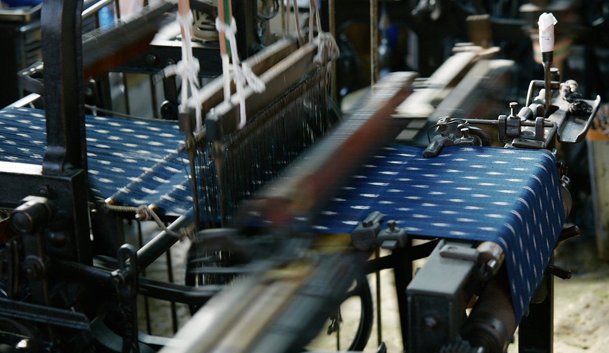 福岡県八女郡広川地区、〈visvim〉のさまざまなプロダクトを手掛けてきた久留米絣工房「冨久織物」は、手織りと機械織りの両方を手掛ける数少ない工房のひとつ。四代目の冨久洋さんは、織りから藍染までを自ら行う職人だ。工場には約100年前から使われている動織機がズラリと並んでおり、ガシャンガシャンと一定周期の稼働音を鳴り響かせている。冨久さんはこの音に耳を澄ませ、常に機械の様子をチェックしているのだという。