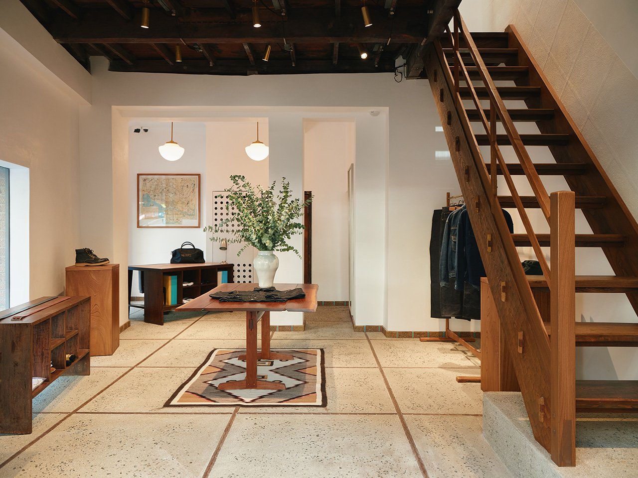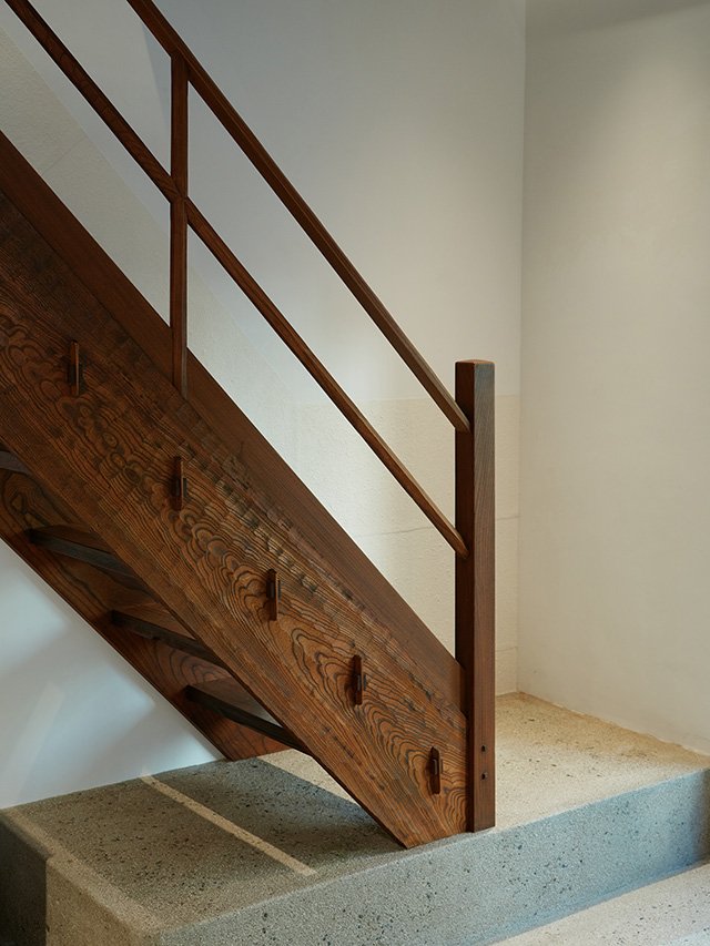階段部分は、京都で日本建築を作る集団「三角屋」の大工さんたちに設えていただきました。手すりは角材に釿(ちょうな)で独特の削り跡を残す「名栗」の手法で仕上げています。ショップ入口にある小さな植栽スペースは、元々生えていた大きな紅葉の木を活かす形で、庭師の安諸貞男さんにお願いしました。