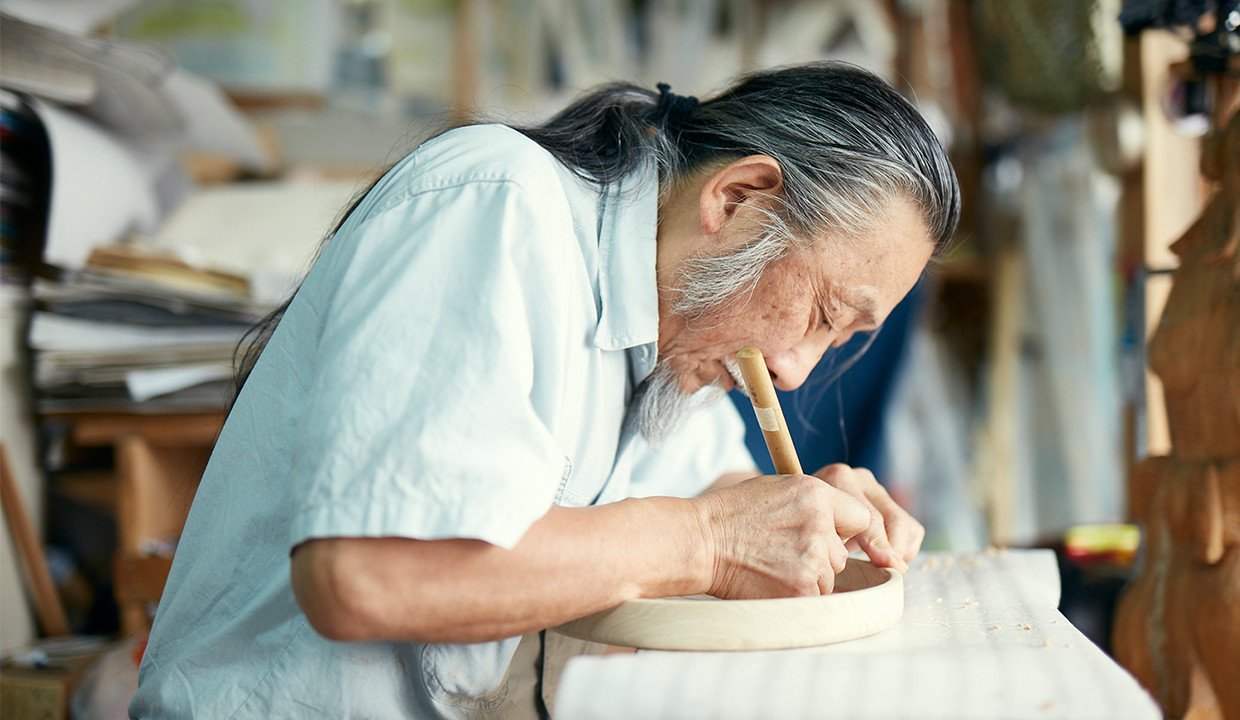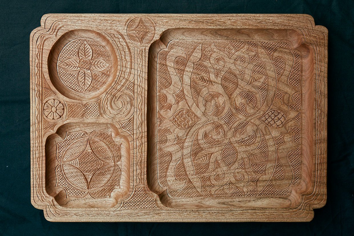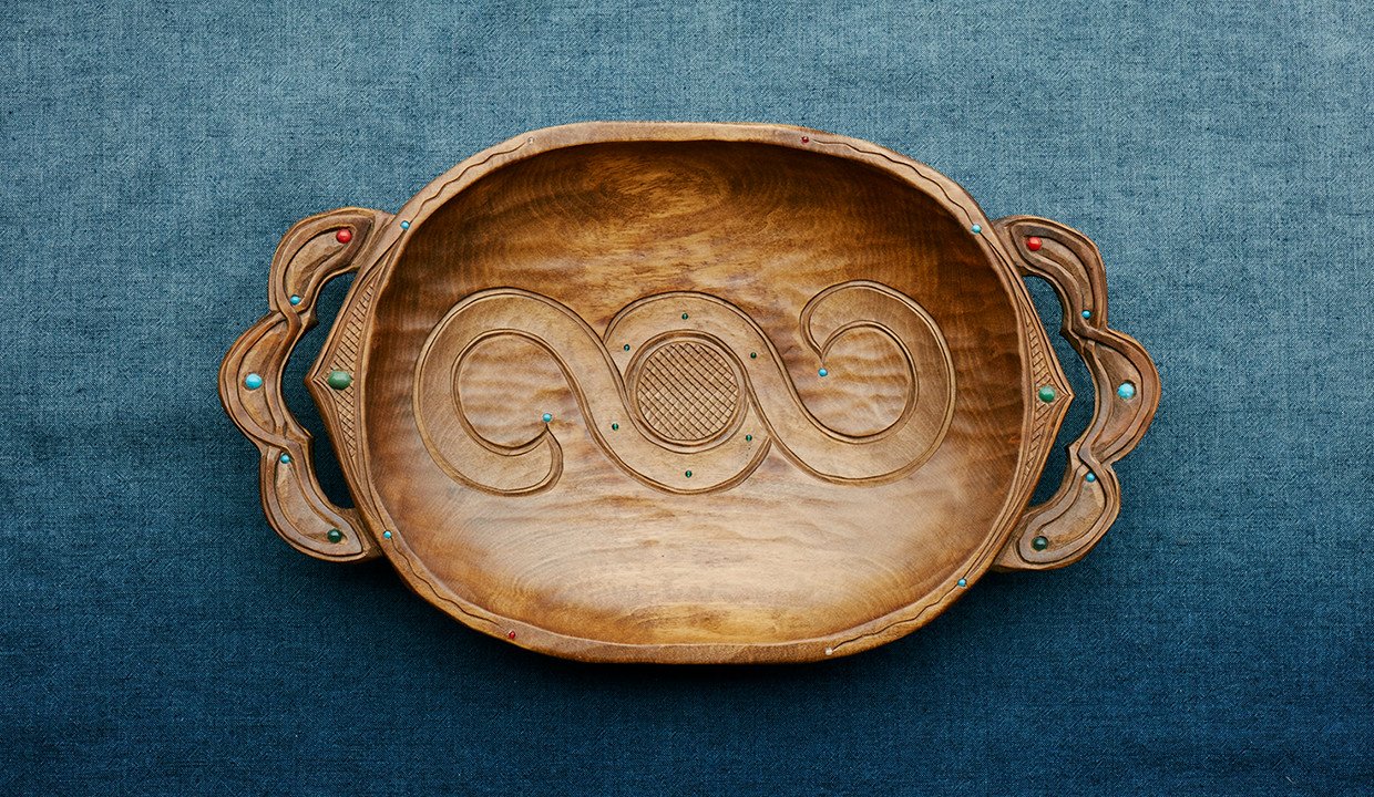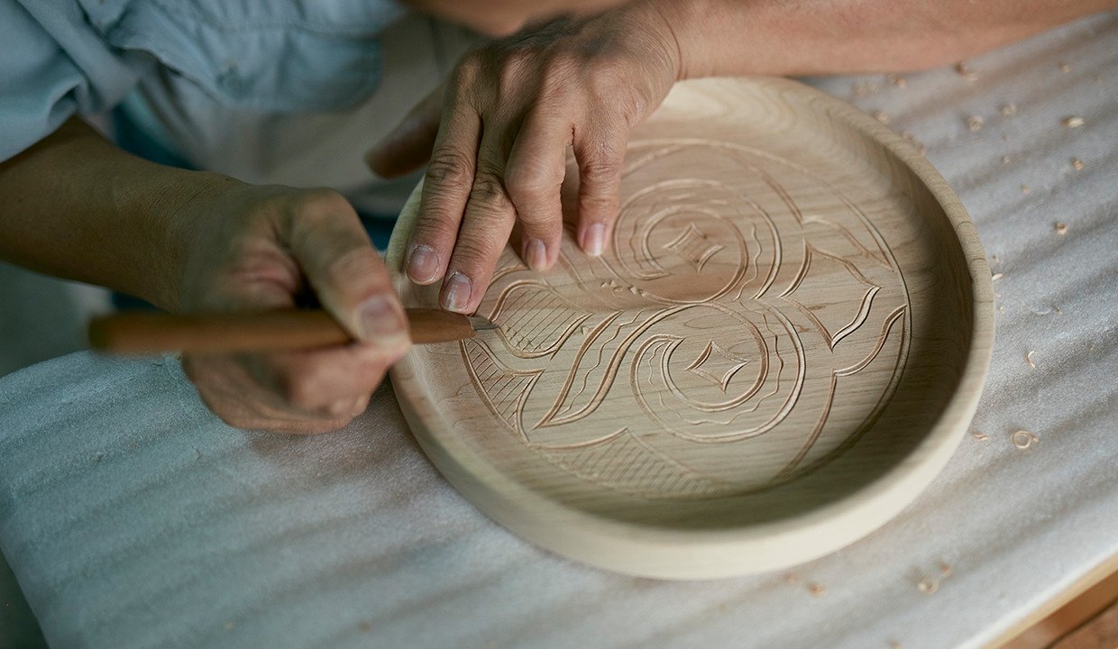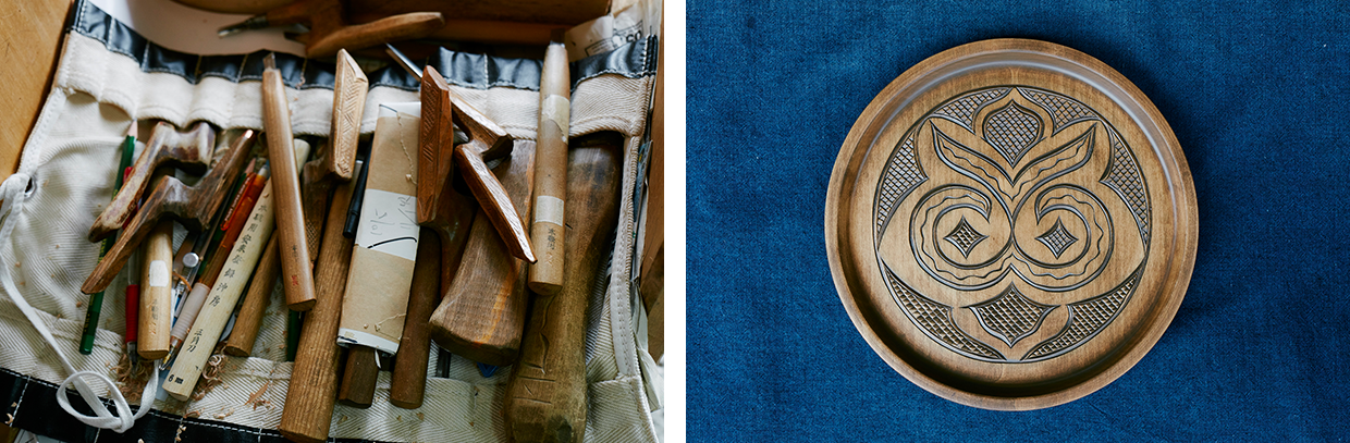 最も多く制作するのは、沙流川流域に古くから伝わる木製の浅く平たい形状の盆「二風谷イタ」。この地方独特の「ラムラムノカ」と呼ばれる緻密なウロコ彫り(魚の鱗状の彫刻)が特徴で、高い技術と集中力を要する技法だ。