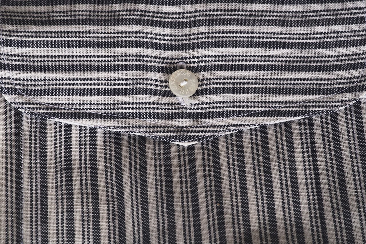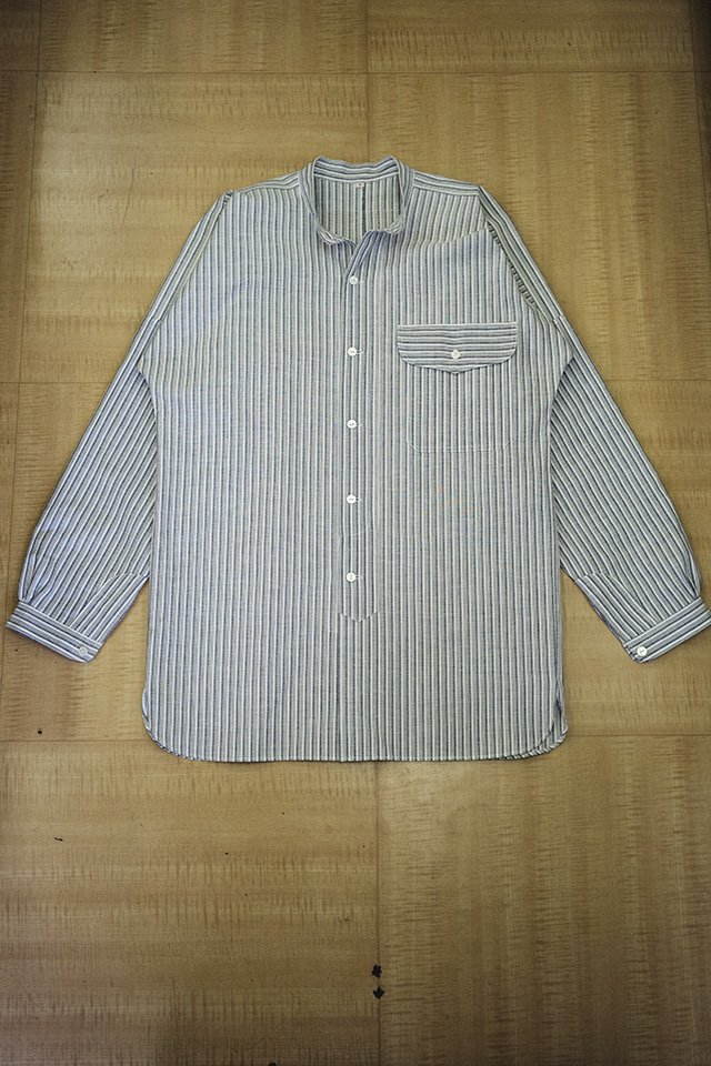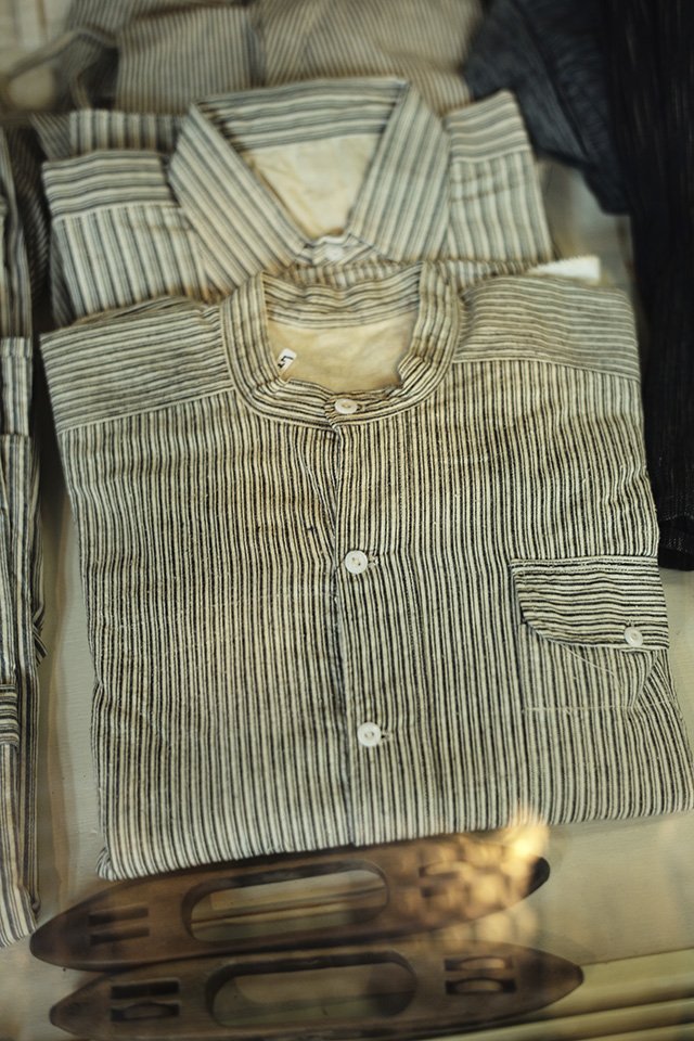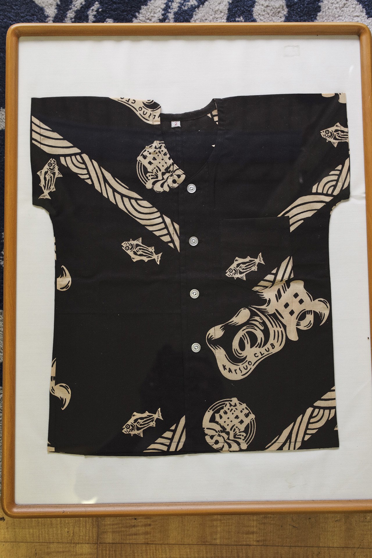 いつしか「鰹縞シャツ」と呼ばれるようになったこの作業着は、漁の仕事における機能性を重視して作られており、頑丈な厚手の木綿素材、動きやすいよう袖ぐりが広く取られたドルマンスリーブ、襟の折り返しのないスタンドカラーと巾の狭いカフス、裾がズボンから出てしまわないよう丈が長く、胸ポケットにはタバコなど小物類を入れるための蓋が付くのが定番のスタイルだった。焼津古来の漁具などを収蔵・展示する『焼津漁業資料館』では、当時着用されたシャツの実物を見ることができる。