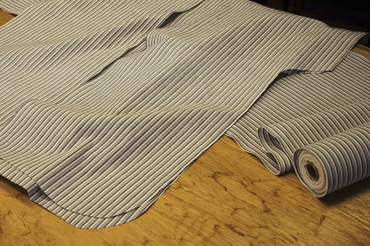 大正末期になると、漁師の男衆の間で白地に青い縦縞模様のシャツが流行する。そのベースとなる生地は、漁師の家の女性たちが大漁祈願と家族の安全無事を祈り、自家用の織り機で織ったもの。彼らはこの手織り布を仕立屋に持ち込み、シャツに仕立てた。南は沖縄から北は三陸沖まで、回遊する鰹を追って全国各地の港を訪れた焼津の漁夫たちはみなこれを着ていたので、非常に目立ったという。