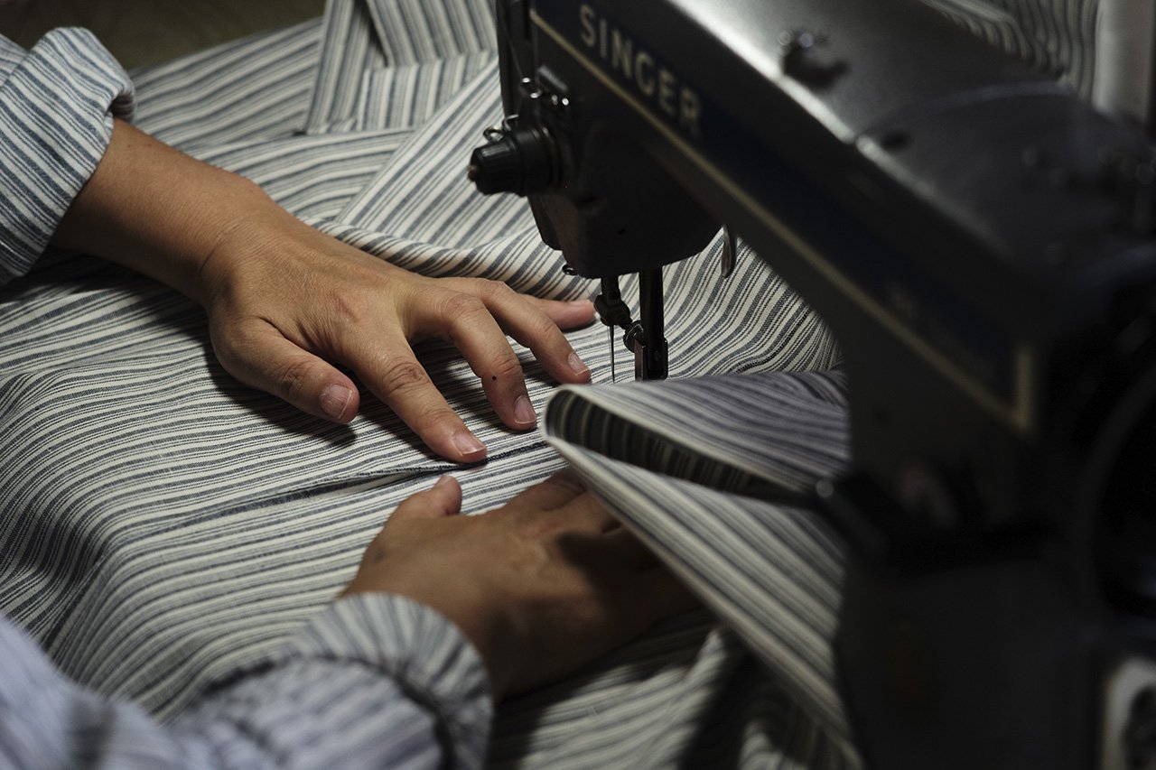 鰹縞シャツは昭和40年ごろまで焼津の男たちに愛用されたが、既製服の普及により、手間のかかる手織りのシャツは廃れ、焼津で戦前に30軒ほどあった仕立屋の数も減少の一途を辿った。そうした状況の中、ただ一人伝統を守り続けたのが、「焼津最後の鰹縞仕立て職人」と言われた、1913年創業の老舗『森省商店』の主、森要三氏(故人)だった。しかし、伝統的な鰹縞シャツを作り続けた森氏も21世紀に入り、引退を決意。"絶滅"の危機となったが、焼津市内で伝統商品を扱う『やきつ家』店主・望月誠さんがこのシャツの文化を何とか次代へ残そうと、後継者の育成を提案。市内に住む、確かな洋裁技術を持つ鈴木明子さんにその型紙と技術が受け継がれることになった。現在は鈴木さんがたった一人で〈森省鰹縞〉ブランドとして、昔ながらの鰹縞シャツを一着ずつ丁寧な手縫いで仕上げている。