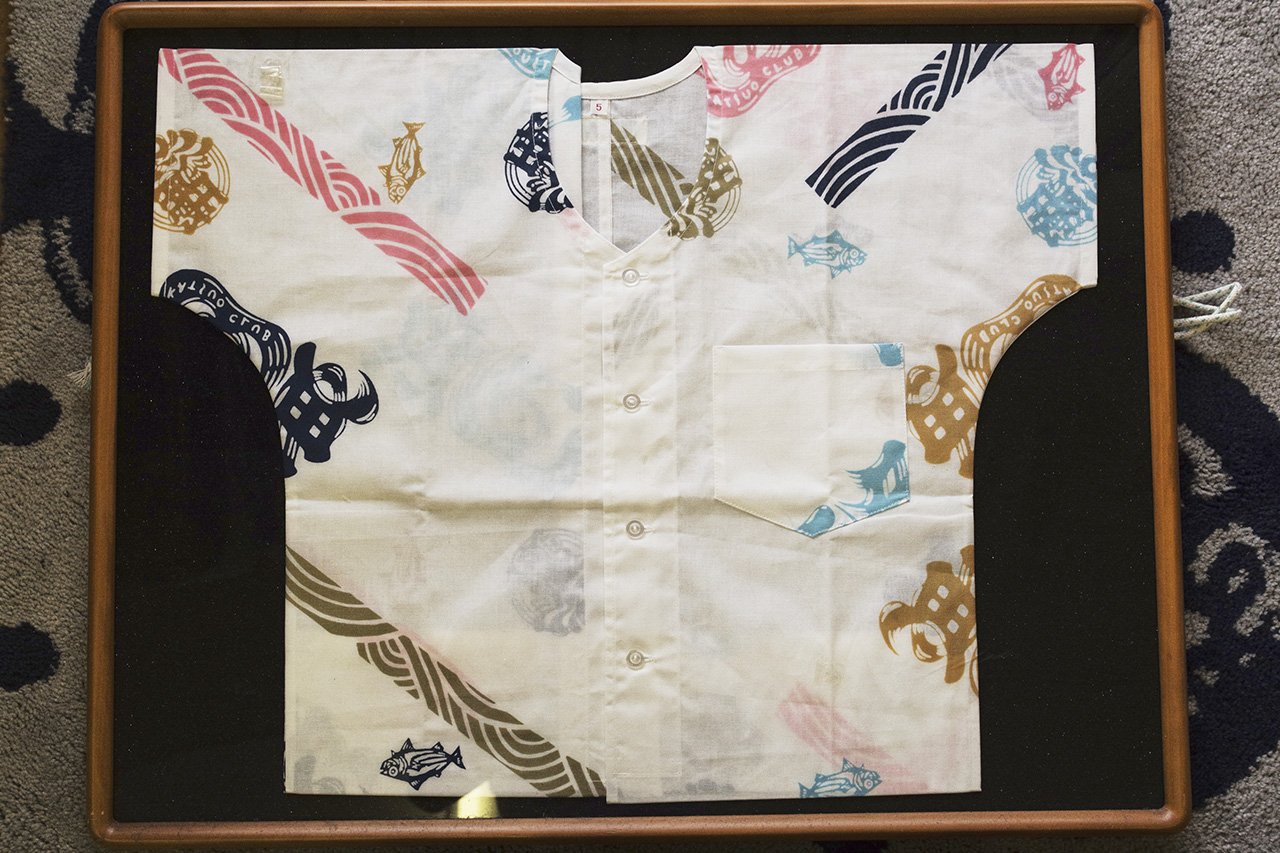 この焼津には鰹縞シャツ以外にもうひとつ、この町の水産関係者たちに愛されたシャツがある。昭和の初めの物が少ない時代、お祭りの際や返礼品として作られた手拭いを利用し、七分袖のシャツに仕立てた「手拭い襦袢」と呼ばれたもの。織りが荒く吸湿性・速乾性に優れた手拭いの素材と、通気性の高いゆったりとしたデザインで夏の衣料として親しまれたこのシャツを、先の『森省商店』の森氏が遠州に伝わる独自の染色技術「注染」の技法で染め、さらに「魚河岸」のロゴマークの入った生地で仕立てて1977年に商品化。これを「魚河岸シャツ」と名付けた。